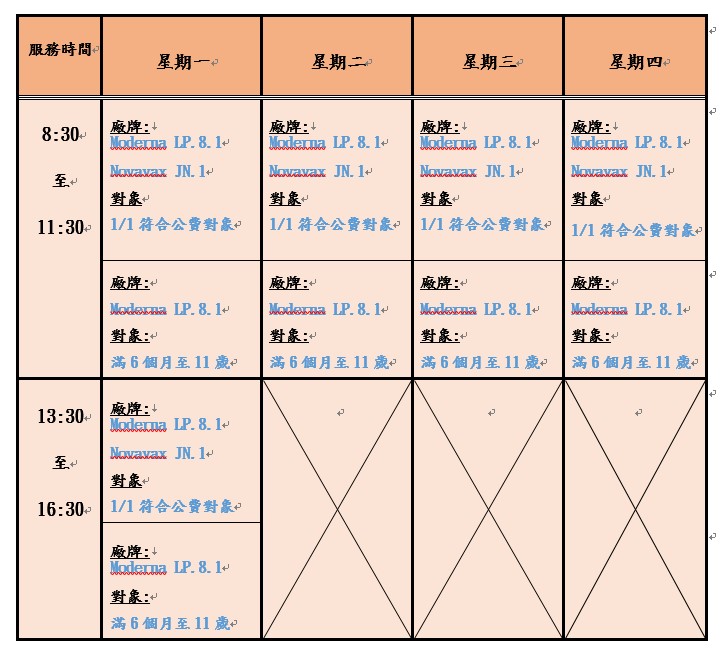 (1) 疫苗品牌及劑量:莫德納 LP.8.1 (0.5ml/劑)、Novavax JN.1 (0.5ml/劑)擇一種施打