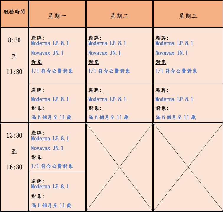 (1) 疫苗品牌及劑量:莫德納 LP.8.1 (0.5ml/劑)、Novavax JN.1 (0.5ml/劑)擇一種施打