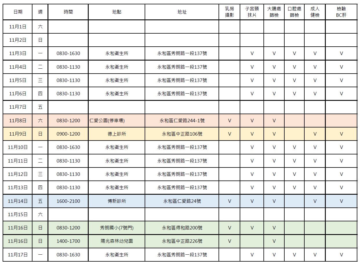 (二)檢查服務項目內容:成人/長者健康檢查、子宮頸癌抹片、乳房攝影、大腸癌糞便潛血篩檢。