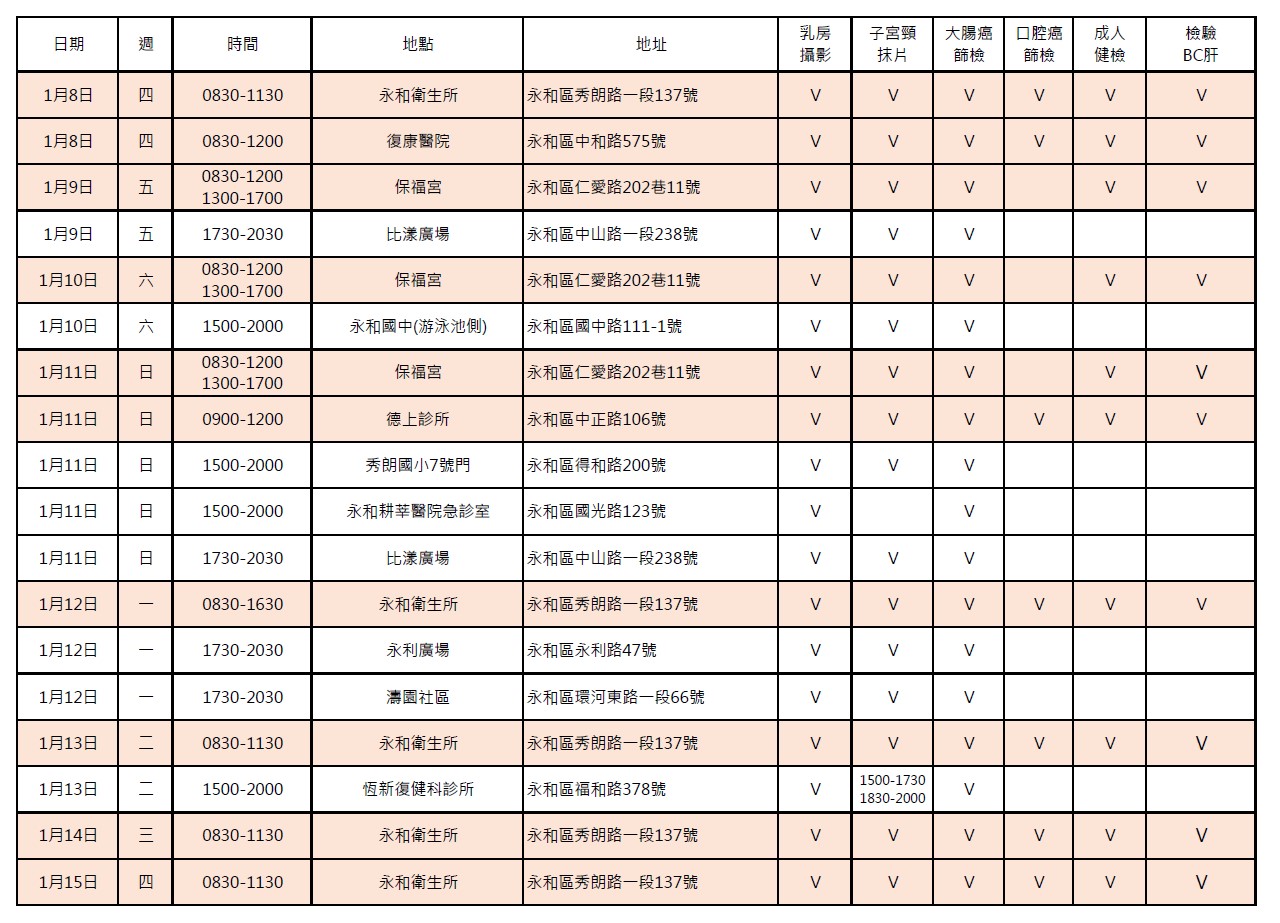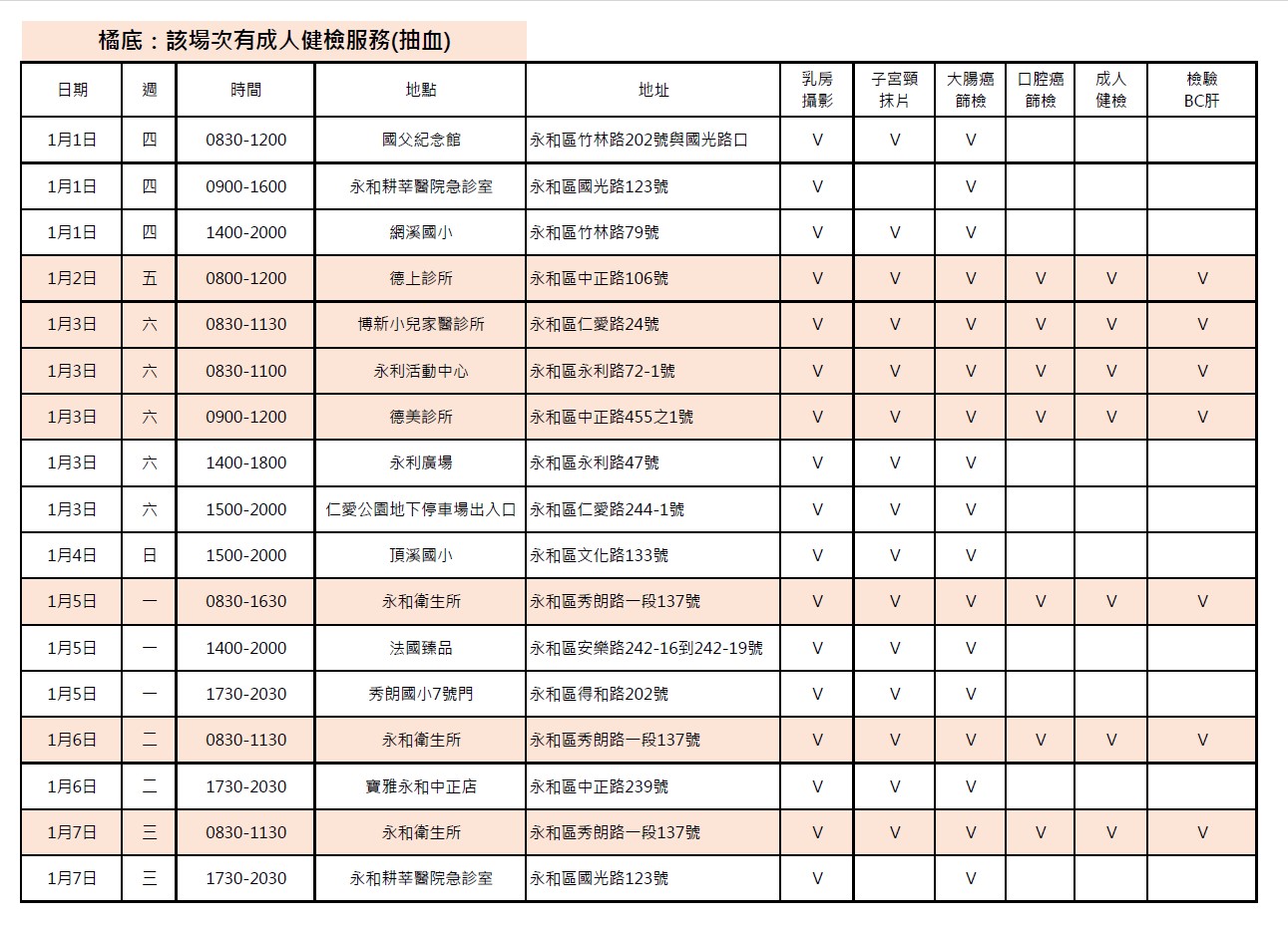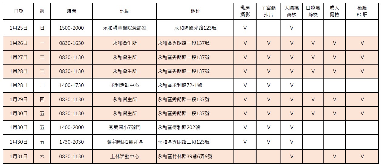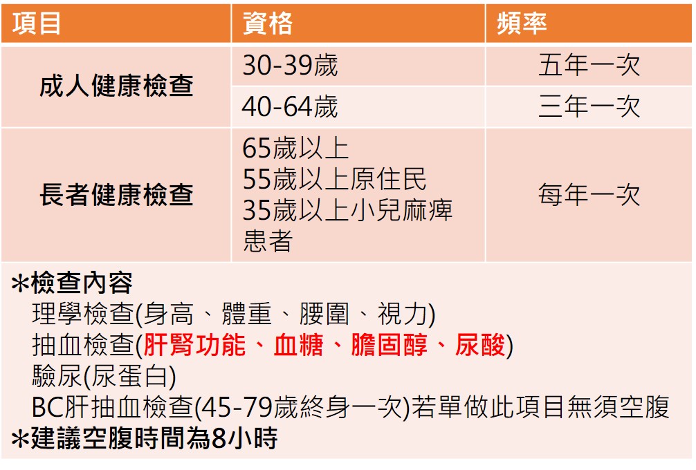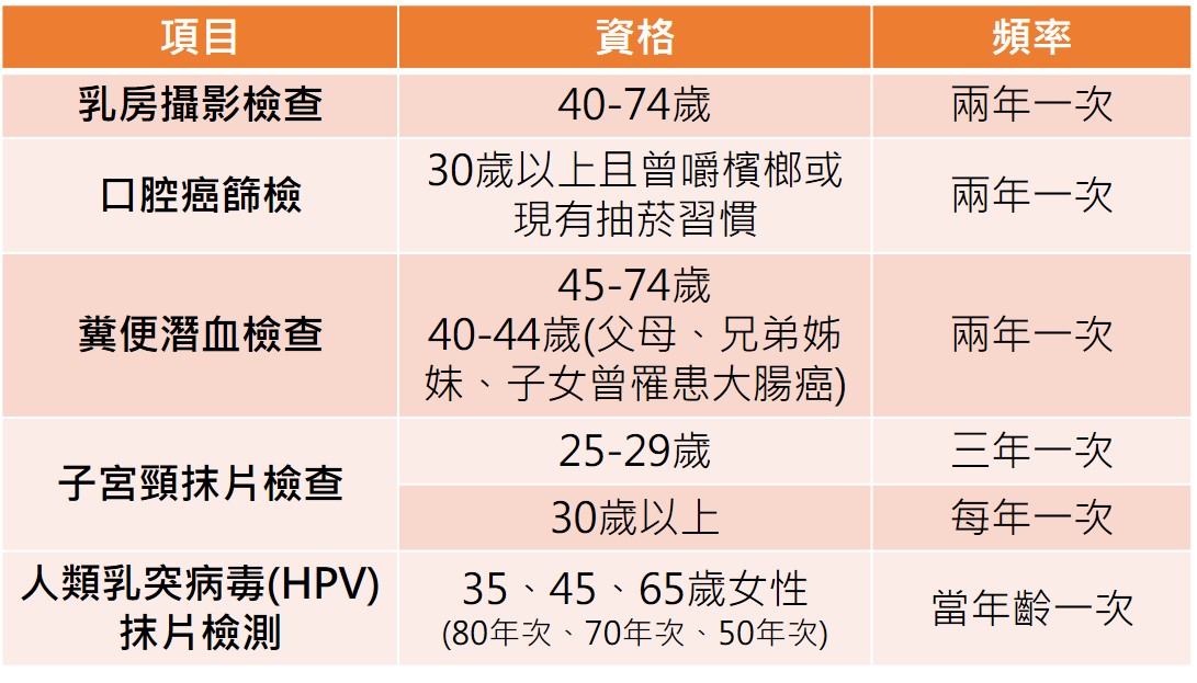 (二)檢查服務項目內容:成人/長者健康檢查、子宮頸癌抹片、乳房攝影、大腸癌糞便潛血篩檢。