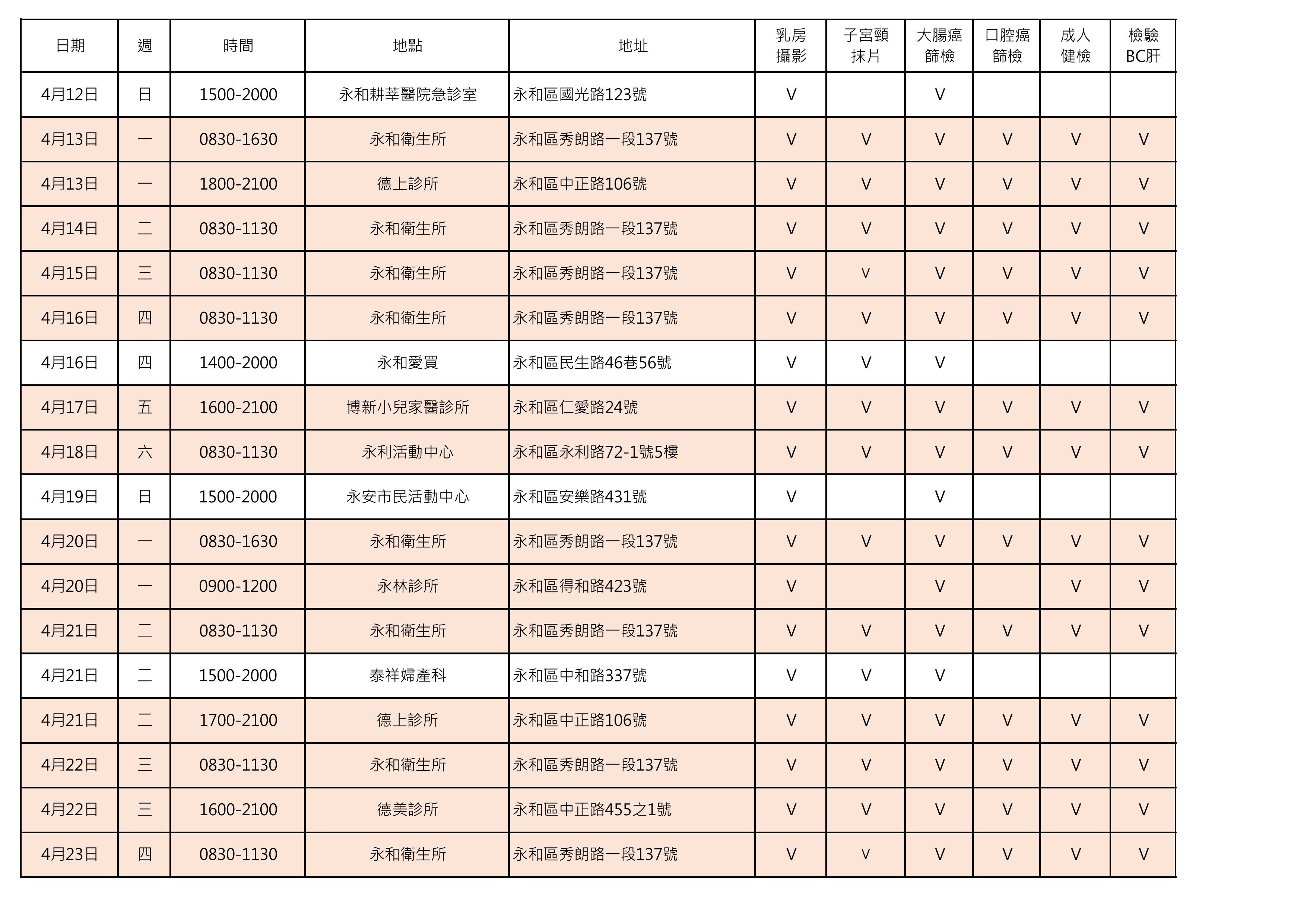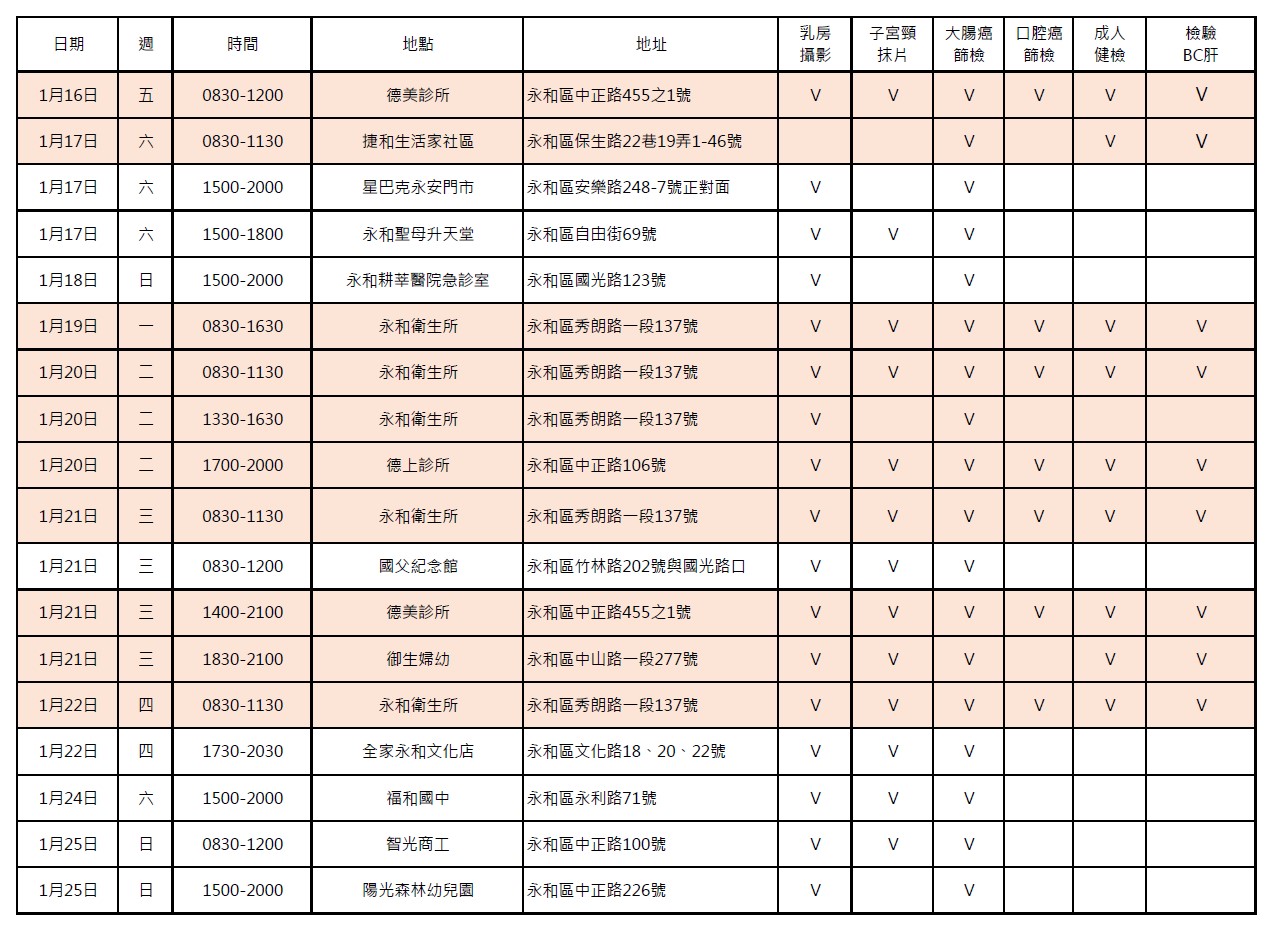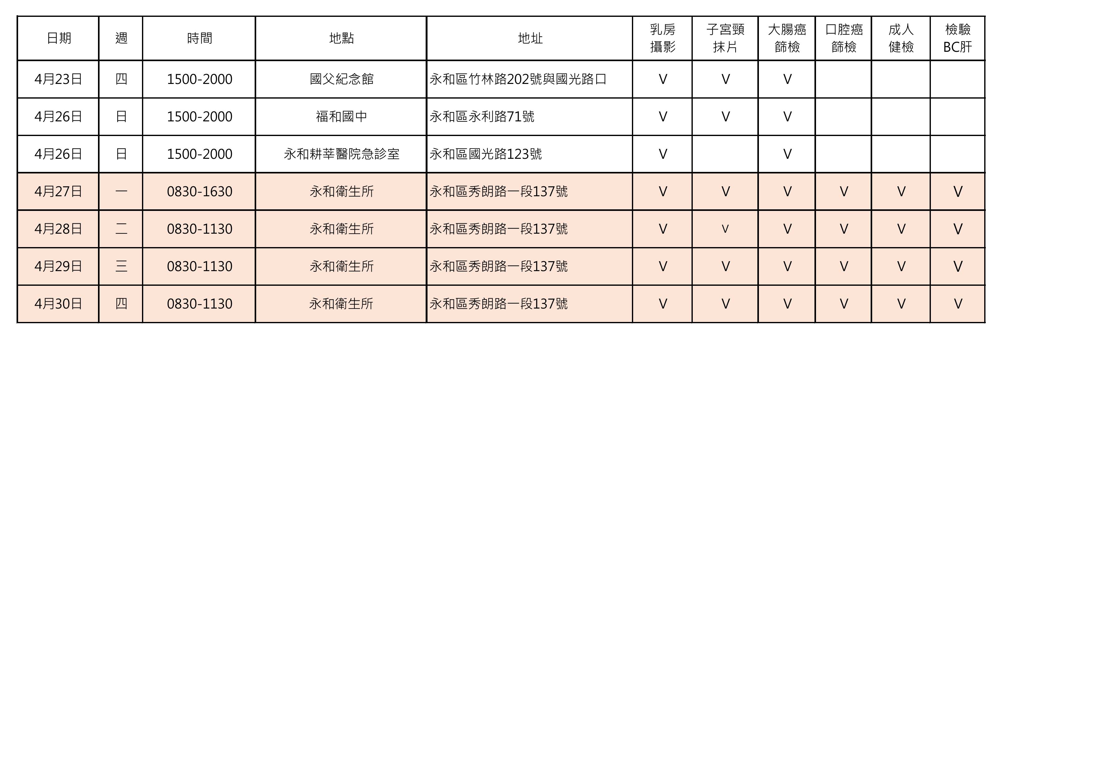 (二)檢查服務項目內容:成人/長者健康檢查、子宮頸癌抹片、乳房攝影、大腸癌糞便潛血篩檢。