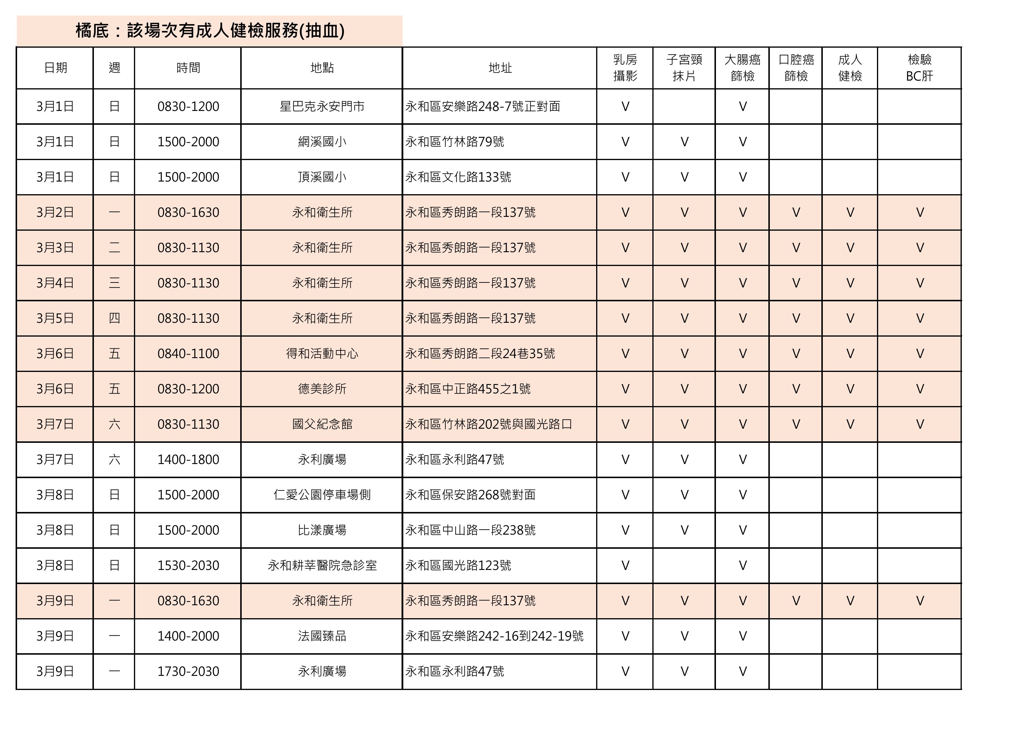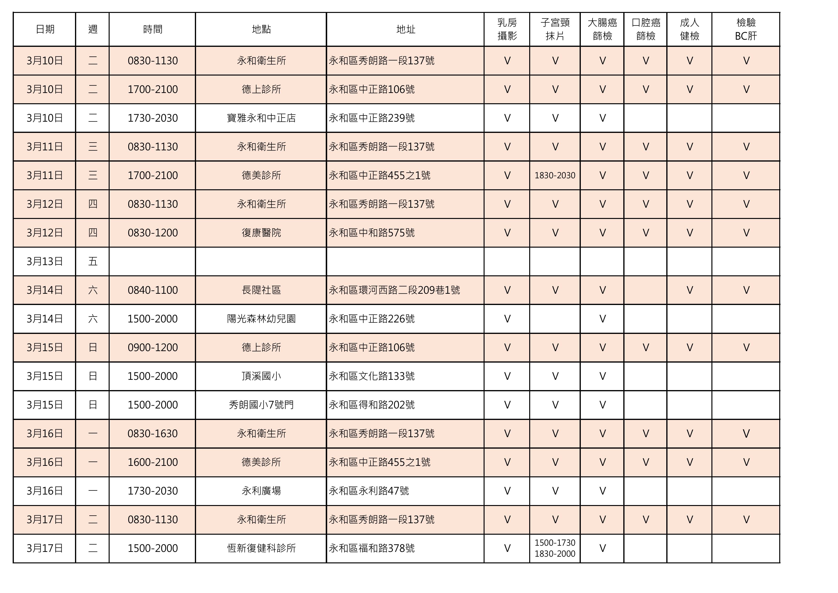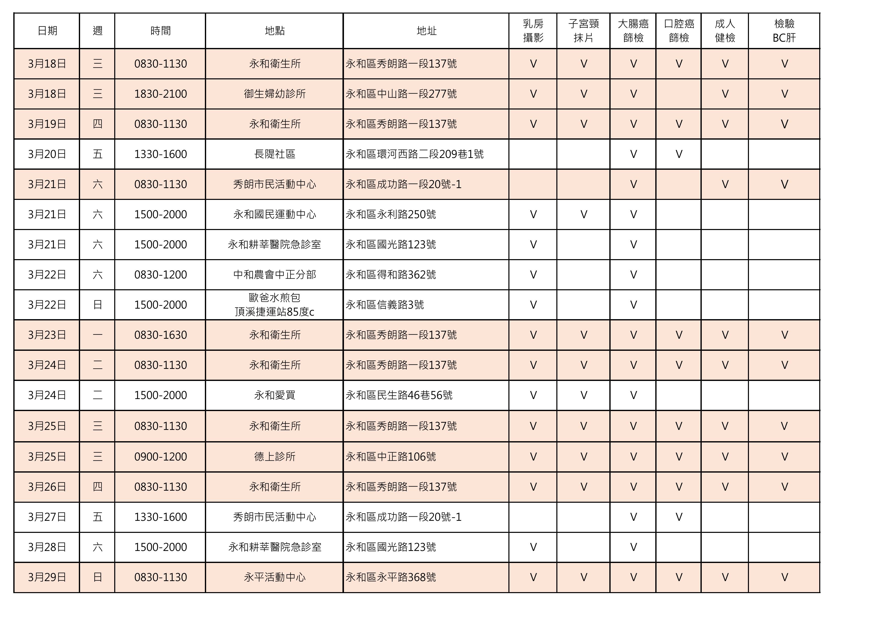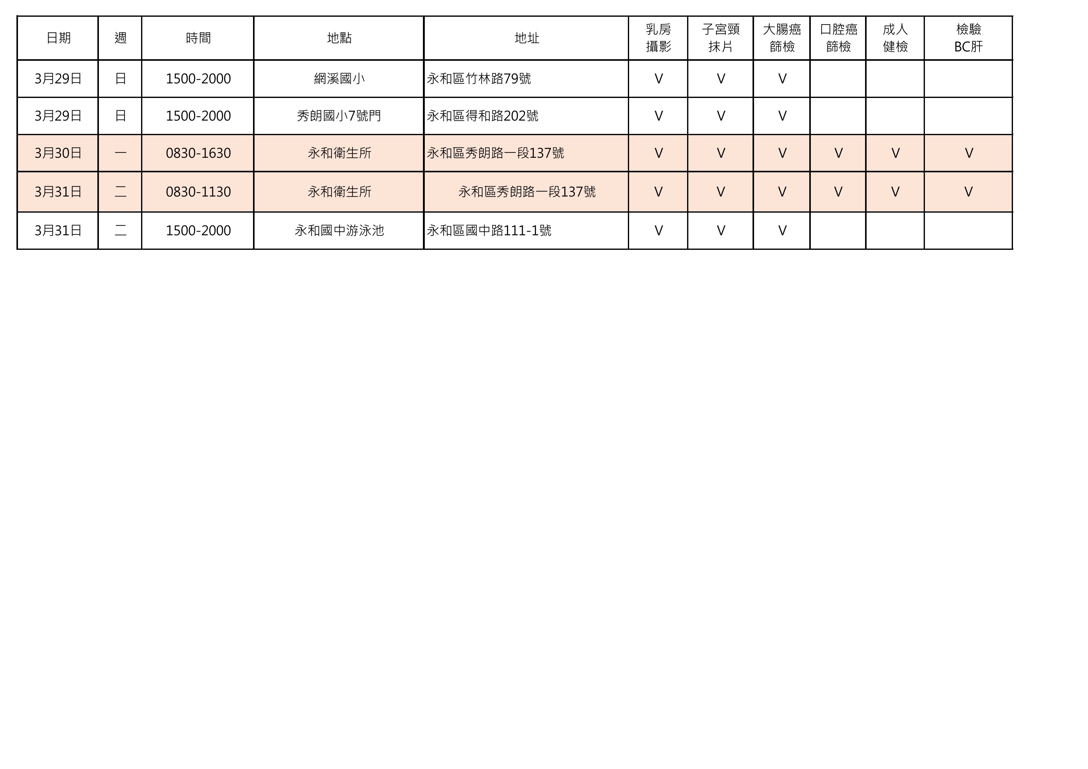 115年3月份永和區癌症篩檢巡迴時間表