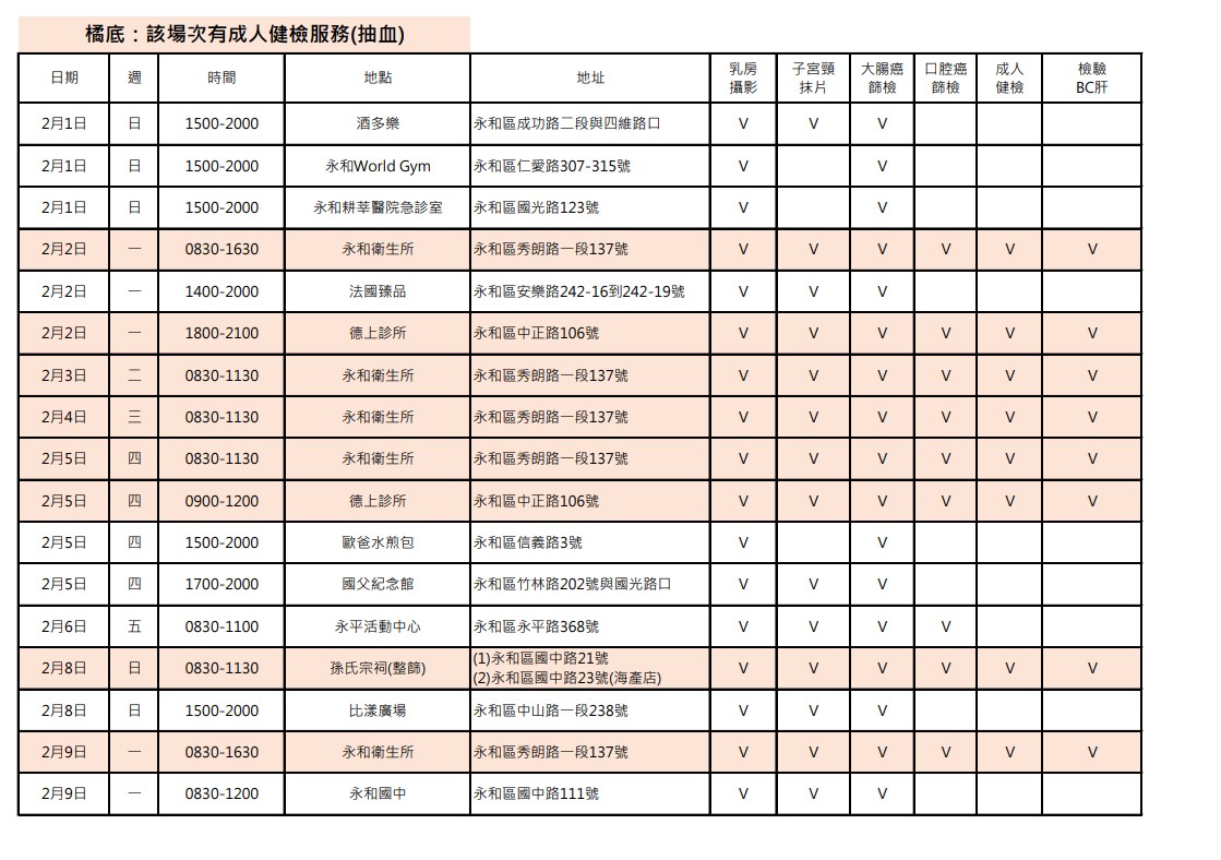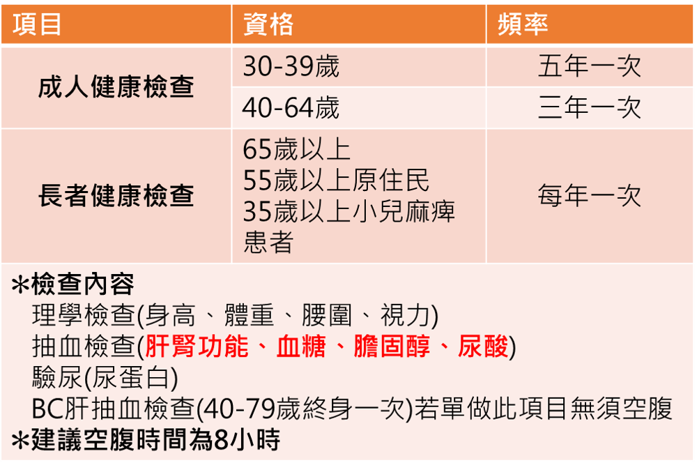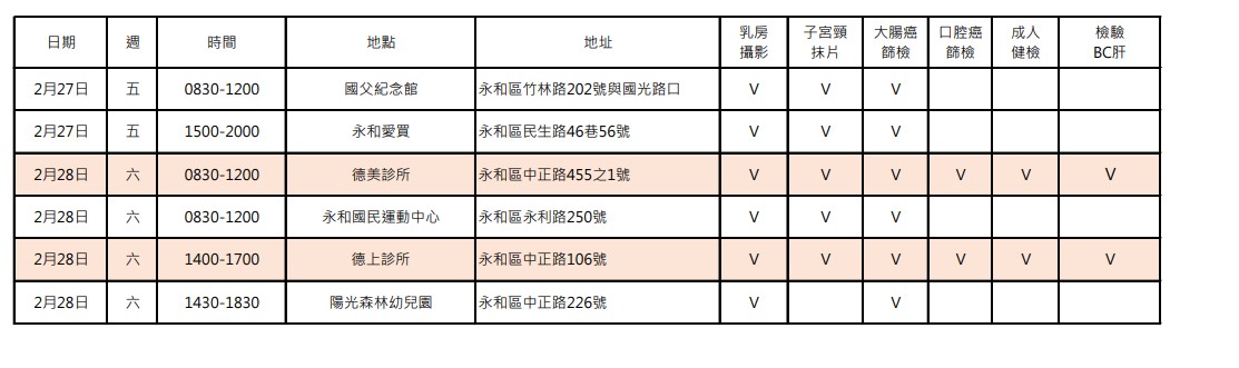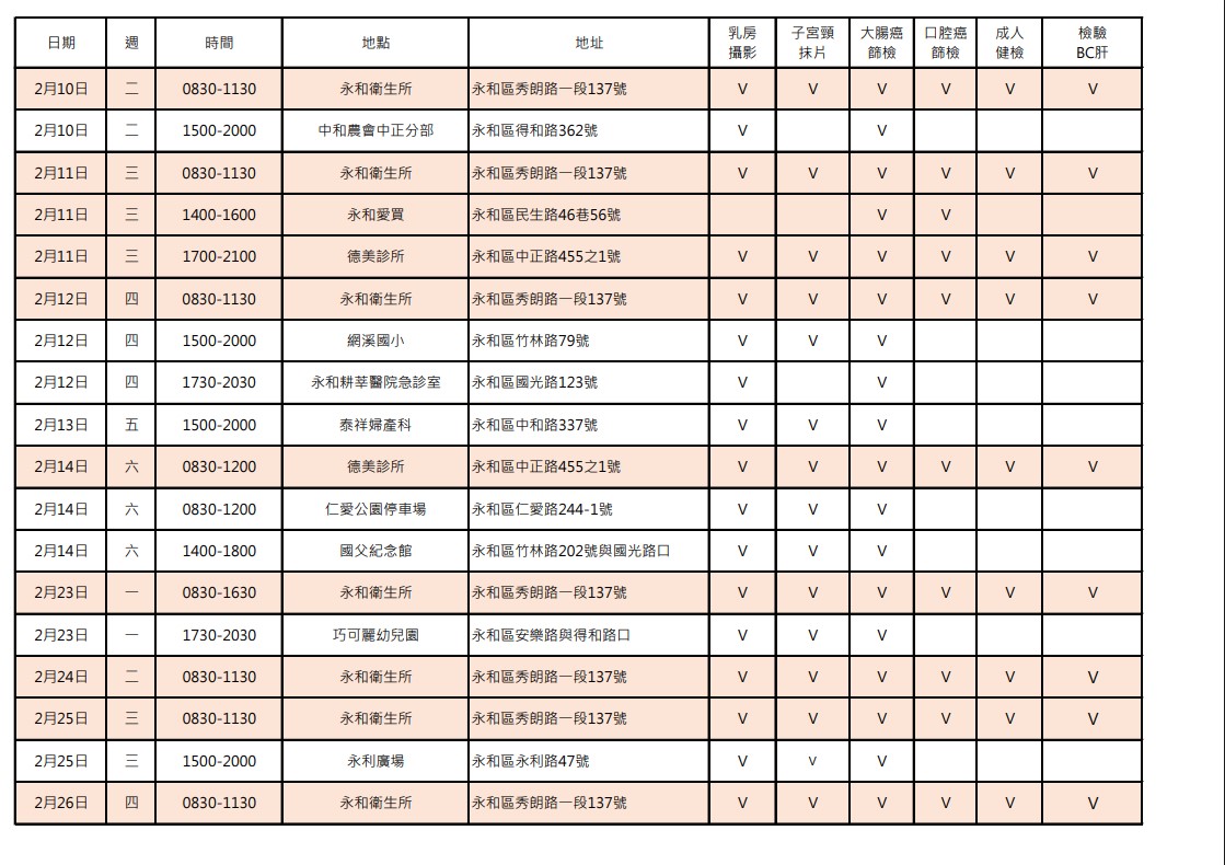 (二)檢查服務項目內容:成人/長者健康檢查、子宮頸癌抹片、乳房攝影、大腸癌糞便潛血篩檢。